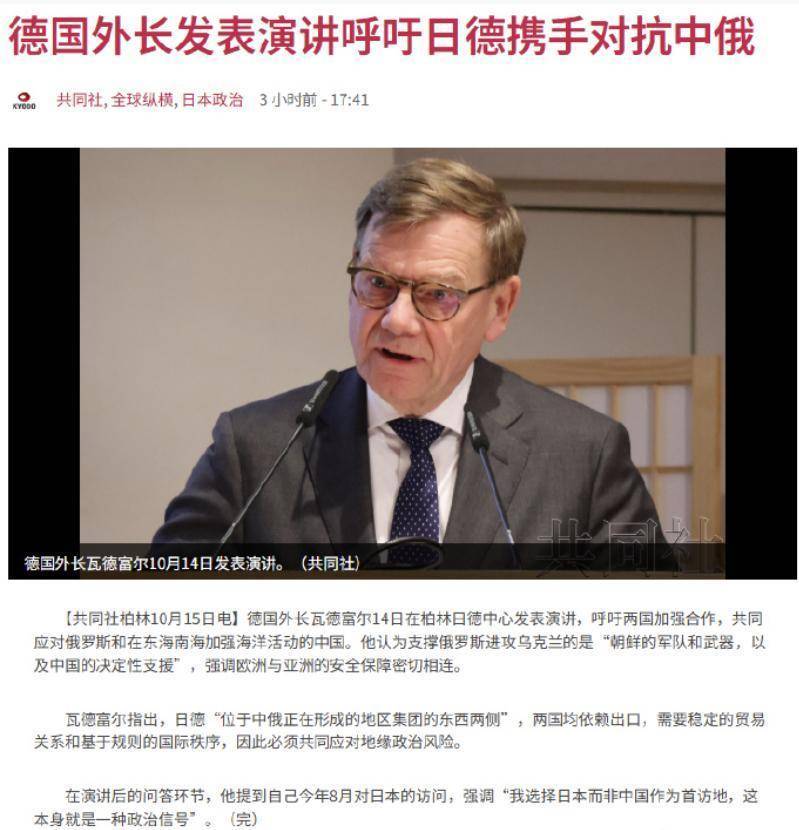 10月14日,德国外长瓦德富尔在柏林日德中心发表演讲时,呼吁日本与德国加强合作众合网,共同对抗俄罗斯和在东海、南海加强海洋活动的中国。他认为支撑俄罗斯进攻乌克兰的是“朝鲜的军队和武器,以及中国的决定性支援”,强调欧洲与亚洲的安全保障密切相连。