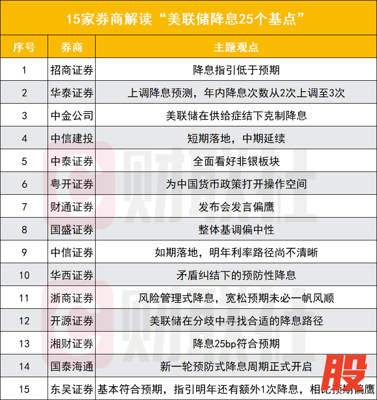 截至发稿, 已有超过15家券商研究所发布相关研报,“符合预期”成为主流判断,而"10月、12月议息会议有望各降息25个基点"获得多数认同 。